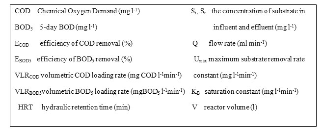 The kinetics of substrate (COD and BOD5) elimination in the bioreactor was estimated a modified Stover–Kincannon model that, at a steady state, has the following form27: