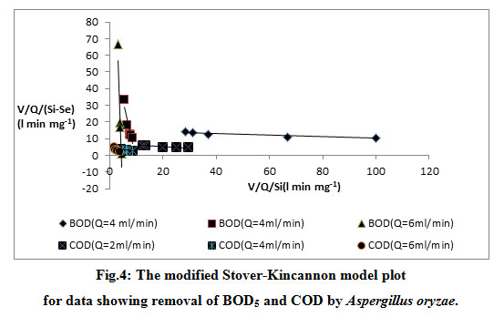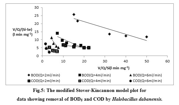 Effect of flow rates on removal of BOD5and COD by biofilms of (Aspergillus oryzaeandHalobacillus dabanensis) and, determination of kinetic constants