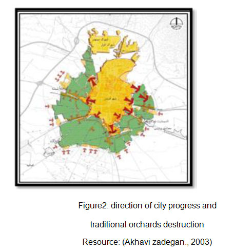 Qazvin has always been low in terms of water resources, but due to its location, it has been a populated area; therefore gardens were considered a vital necessity for the population (Parhizgariet al., 2012). Traditional gardens were so important in Qazvin`s culture and life that Dehkhoda - a prominent Iranian linguist, and author of the most extensive dictionary of Farsi - selected "Dakho" as his literary pseudonym which means the guardian of water’ (www.yjc.ir., 2014). Qazvin s suburban traditional gardens have turned it to a large garden-city, meaning that the city was surrounded by a chain of gardens that shaped a green belt around the city, protecting it from severe climatic conditions, as well as being a great source of income for its inhabitants. During last three decades, the city is expanded toward its green belt, a large number of these treasurable trees were removed and the integrity of the orchards is threatened.
