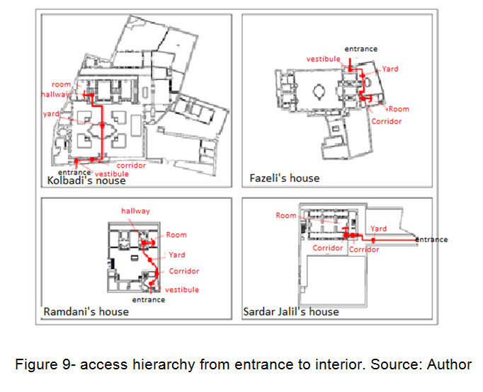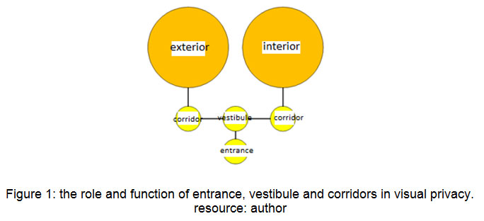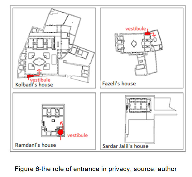 在传统的建筑中,房屋入口的结构是设计的一种方式,即古兰经诗歌关于面纱的情况。(Masaeli,2009)。通过限制入口处的愿景和创造隐私,架构为其居民创造了隐私。传统建筑师认为,房子的门不应在一起或面对面。它应该是防止直接看房子之间的距离。(Okhovat,Almasi Far,Bemanian,传统建筑和伊斯兰国家的城市主义,2010年)。传统房屋中的输入空间是从几个部分创建的,并且它们中的每一个都具有Ceratin身体和功能性。(Sultanzadeh,2005).vestibule是港口后通常是港口的空间,其主要功能将入口路径分成两个或多个方向。(Sultanzadeh,2005)。前庭应该被视为传统房屋内隐私的最佳例子之一。 In vestibule with two hallways were placed to enter the interiors (private residence) and exterior (staying guests). The interior is the residential space of peoples and other peoples does not have to be entered. (Pirnia等。,2010)。前庭最重要的表现正在将入口路径分成一些方向和保护房屋隐私的部分。(Nikbakht.在al., 2002)。传统建筑通过设计入口后的前厅,将室外的公共空间与室内的私人空间分开,完全封闭了行人的视线。(Masaeli, 2009)换句话说,在打开门之后,将外部对内部的直接视觉关闭,将尊重隐私原则。(Bemanian等。,2010)。走廊是另一个入口空间,使两个地方之间存在关系。在传统的房屋中,进入院子是通过拧紧走廊,这可以防止直接愿景入口并创造一种隐私。(Bemanian等。,2010)。通过这种方式,隐私问题通过连接前庭的走廊来解决。(Sultanzadeh,2005)。因此,前庭和螺纹走廊与室内和外部院子削减了外国人的视野和家庭。(Pirnia, 2013)。伊斯兰学者认为,应通过在城市组织和房屋之间创造深入走廊来摧毁房屋输出的视野。(Okhovat.等等。, 2010)。前庭在偏心传统房屋中的作用和功能类似于内向的房屋。拉什特市的Samii,Abrisham和Ghadiri房屋的前庭是内部和外部的分隔符。通过这种差异,在三个样本中,通过空间直接,而不通过分离器过滤器。(Shafi Zadeh.等, 2014)(图1)。