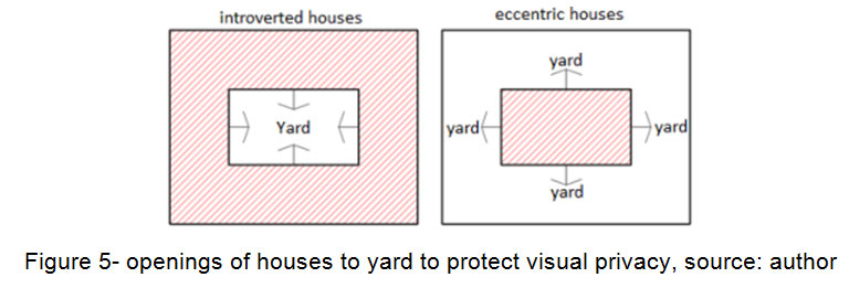 内向传统房屋内港口距离问题不是保护隐私的有效因素。在没有开口的情况下设计的围墙(预计入口),不允许传递者看到房子,而偏心房屋中端口的距离有不可否认的内部隐私作用。提供位于道路旁边的偏心房屋的隐私比其他房屋更困难。虽然通过防止墙壁上的开口俯瞰到道路上,但是在较低地板(底层)中的非定位开口或使用几何图案进行开口,因此为家庭的隐私付出了很多关注。