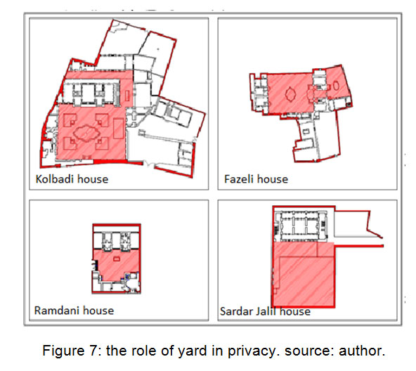 所有的房子都有院子。在Kolbadi和Fazeli的住宅中,内部和外部庭院都是独立设计的。Ramdani和Sardar Jalil的房子只有一个室内庭院。所有的院子都被高砖墙包围,以防止人们看到房子的院子(图7)。