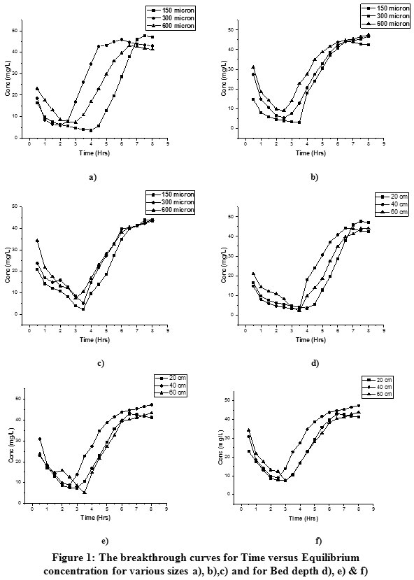 用初始CR进行三个选定吸附剂尺寸150,300和600微米的列实验的复制+6浓度为50ppm。如前所述,本研究共构建了9个不同因素的实验集。表1显示了Cr的浓度+6柱吸附中的0.5至8.0小时。注意到金属离子去除速度增加,直到特定的时间增量,后来,它逐渐降低,因为它达到吸附材料的饱和度。用于每种实验组的新鲜吸附剂,观察到上述因素的吸附能力,具有三个水平。针对所有三种吸附尺寸和值计算的复制的平均值在表1中给出。柱突破性分析在吸附剂的饱和时间和吸附程度上呈现了一个想法,因此可以与其他吸附剂进行比较它们的适合性分析。所选择的吸附剂尺寸的突破曲线绘制20cm,40cm和60cm的床深度,如图1a),b)&c)所示。显然是最小的大小吸附剂,即150μm达到比其他突破(平衡)浓度达到突破(平衡)浓度。最高的性能(去除)为2.23ppm,5.13ppm和7.45ppm分别如150μm>300μm>600μm尺寸所示。上述具体说明,吸附剂尺寸越小,吸附容量越大,虽然表面积较小的颗粒较小但更多的这种颗粒占据柱子可能是原因。