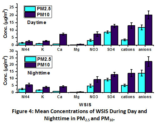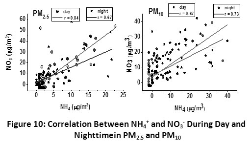 对PM中阳离子和负离子总量的比较研究表明,PM中阳离子含量较高-10 - 2.5在白天(73%)和夜间(63%)和在白天(59%)和夜间(62%)的精细模式下更高百分比的阴离子(62%)。早期的研究还建议了CA等阳离子2+和毫克2+地壳起源和NO3.-所以42 -人为来源。NH的精细模态存在4+与夜间(45%)相比,白天(63%)的注意力较高。同时,k+在fine模式中描述白天(59%)和夜间(56%)的可比百分比。
