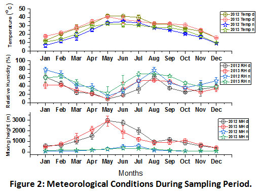 2012年和2013年气温(T)、相对湿度(RH)、混合高度(MH)等气象参数从http://ready.arl.noaa.gov/READYamet.php链接下载。T有明显的季节性,冬季最低,夏季最高。5月份的月平均值最高,1月份的月平均值最低。T的月平均值在大约10之间变化oC - 40oC.与季风季节相比,冬季和夏季的昼夜平均温度差异较大。月平均相对湿度从约。15 - 75%。相对湿度的日变化表现为夜间高于白天。场地的混合高度(MH)代表低层大气的对流潜势。冬季的MH观测到几百米,而夏季的则上升到几千米。白天和夜间的平均混合高度说明,夏季白天比夜间高得多,而季风季和冬季这种差异逐渐减小(图2)。