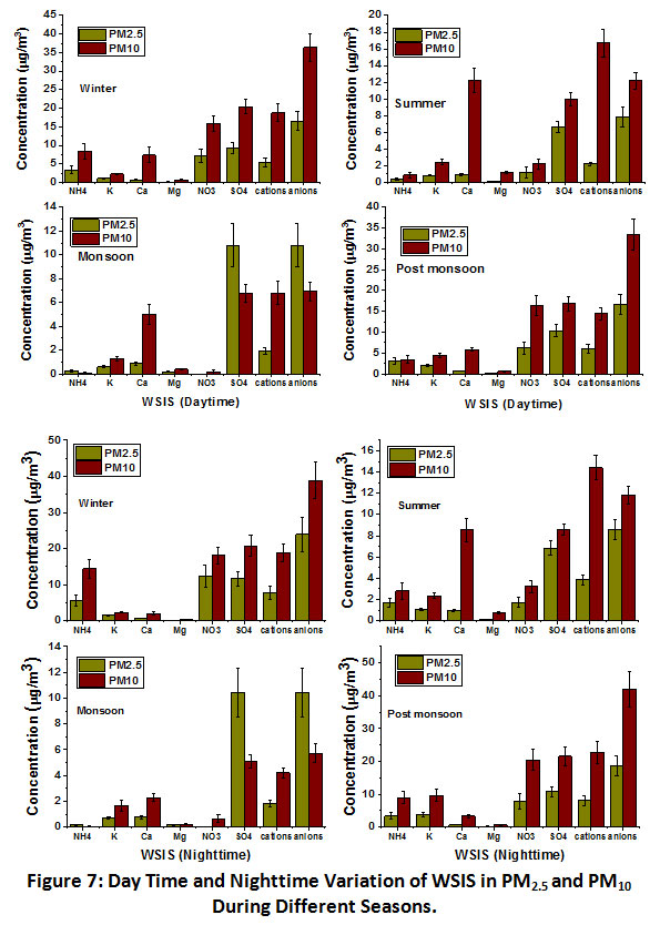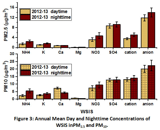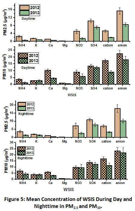在白天,所有的WSIS在PM2.5和点10除K+.K+在下午10在2012年均达到了2.64µg/m3.)和2013(2.73μg/ m3.).2012年,NH4+,Ca2+在下午10分别为3.53和10.12µg/m3.分别。显著高白天Ca2+在下午10表明它们在粗糙的模式和有利的气象条件下的优势,由于太阳、风和人类活动诱导矿物从地壳再悬浮。白天不3.-所以42 -在下午10为8.97µg/m3.分别为5.78和12.18µg/m3.分别为2013。此外,白天不3.-所以42 -在下午2.5分别为5.01µg/m3.为2012和1.36和7.01 μ g/m3.分别为2013。