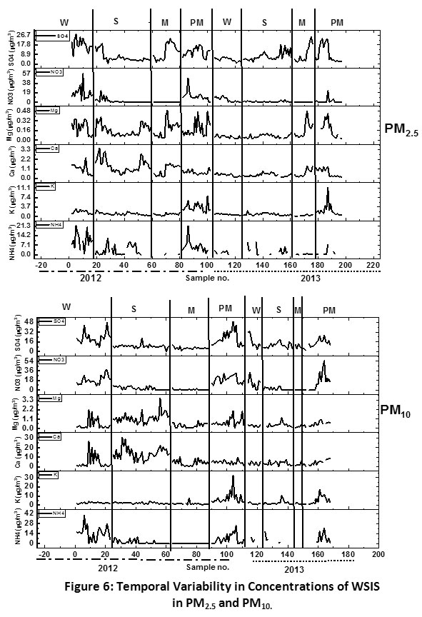 WSIS 2012年1月至2013年12月的时间序列如图6所示。WSIS的高峰出现在冬季,高峰出现在季风季节。这种季节性的变化可能是由于气象参数的变化。K+在季风时间内,在季风时间内呈微小和粗模式颗粒显示出透明峰,这表明其与附近州的生物质/作物残留物的关系。早期的研究也建议高k+生物质燃烧期间的浓度。高浓度的其它离子,如NH4+、钙2+、镁2+,没有3.-所以42 -是在冬天观察到的。与其他季节相比,冬季的高浓度趋势可能是由于无风条件盛行和混合高度较低,限制了大气中WSIS的稀释。高钙2+而PM10比下午2.5.Ca2+夏季的峰可能归因于较高的风速和温度,促进了大气中的土壤重新悬浮。唯一的所以42 -在季风季节展示了一些峰,这可能是由于它们在精细模式下的形成。