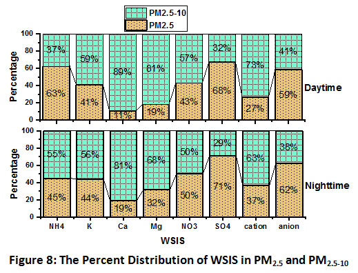 分析观察下午WSI主导地位的分析2.5和点-10 - 2.5是完成了。在这个分析中2.5从PM中减去的10,它给了PM-10 - 2.5.Ca的百分比2+在下午-10 - 2.5分别为89%和81%(图8)。然而,SO的百分比分布研究42 -显示了他们在总理中的主导地位2.5.精细模式SO42 -白天和夜间分别为68%和71%。在精细模式中,较高的百分比表明它们起源于二次气溶胶(通过气粒转换)。
