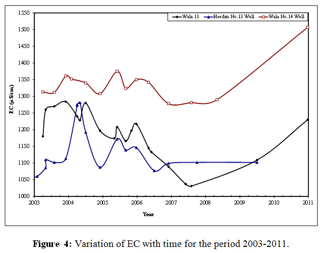 - 的物理测量地下水samples showed that, the average electrical conductivity (EC) values range between 983 and 1430 μS/cm. All wells drilled in Wala area have the highest EC, while the EC wells of Swaqa area have the lowest values of EC.