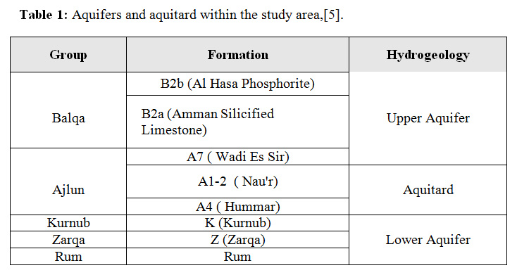 Six aquifer complexes are distinguished in Dead Sea Basin from top to bottom, (WAJ, 2012): Amman - Wadi Sir (B2/A7) aquifer, Hummar (A4) aquifer, Naur Aquifer (A2) aquifer, Kurnub (K) Sandstone aquifer, Zarqa (Z) group aquifer and Rum group (Disi) aquifer. Groundwater resources within the Dead Sea Basin are found in two different aquifer complexes as shown in Table 1, the upper limestone aquifer complex and the lower sandstone aquifer complex, these two aquifers are separated from each other by a major aquitard.6