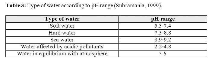Table 3: Type of water according to pH range (Subramania, 1999). Click here to View table |