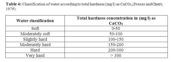 Table 4: Classification of water according to total hardness (mg/l) as CaCO3,(Freeze and Cherry, 1979) Click here to View table |