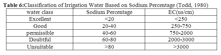 Table 6: Classification of Irrigation Water Based on Sodium Percentage (Todd, 1980) Click here to View table |
